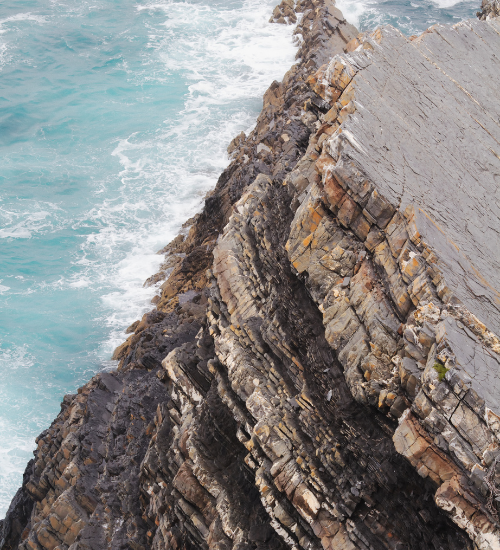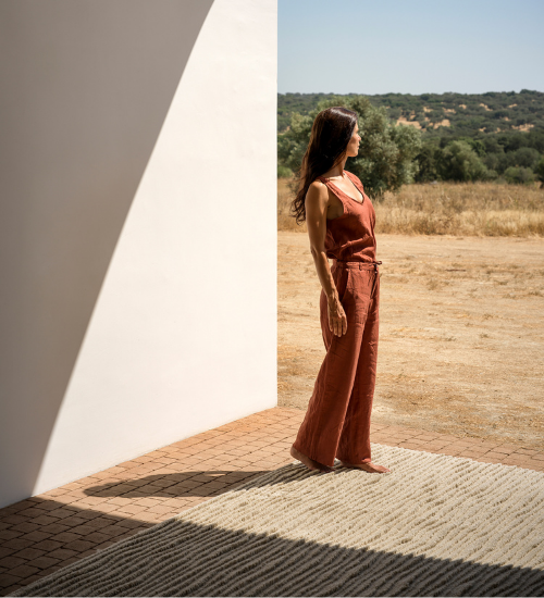 It evokes the southern coast of the Alentejo: worn cliffs, contours eroded by the sea, the trace of wind over sand.
